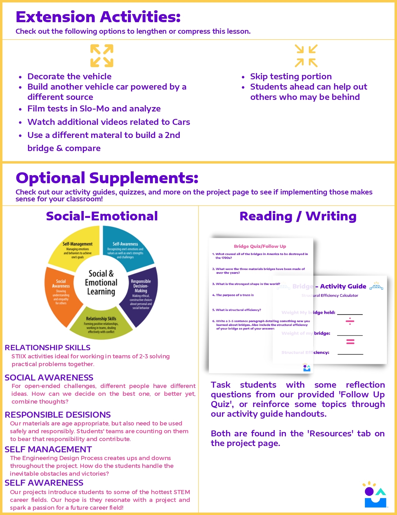 Set in the growing city of STIIX-Ville, students are tasked with developing innovative vehicles to support the town’s expanding highway system. Through this challenge, students will explore kinetic and potential energy, friction, and mechanical advantage while documenting their design process and evaluating the performance of their cars📝